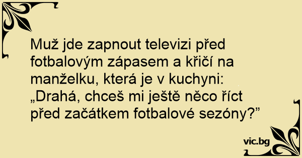 Muž jde zapnout televizi před fotbalovým zápasem a křičí na manželku, která je v kuchyni: „Drahá, chceš mi ještě něco říct před začátkem fotbalové sezóny?”