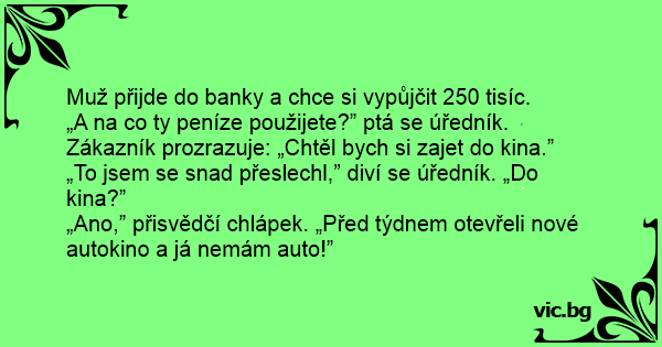 „Ano,” přisvědčí chlápek. „Před týdnem otevřeli nové autokino a já nemám auto!”