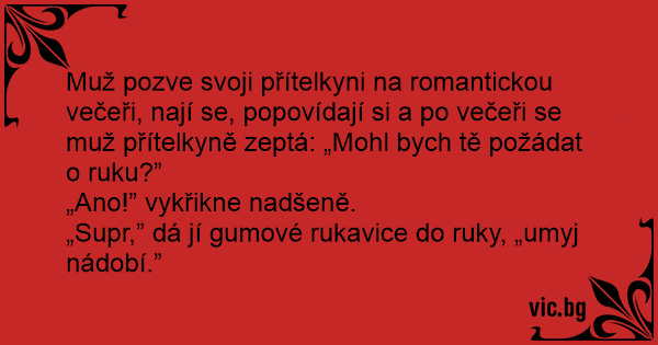 Muž pozve svoji přítelkyni na romantickou večeři, nají se, popovídají si a po večeři se muž přítelkyně zeptá: „Mohl bych tě požádat o ruku?”