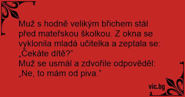 Muž s hodně velikým břichem stál před mateřskou školkou. Z okna se vyklonila mladá učitelka a zeptala se: „Čekáte dítě?”