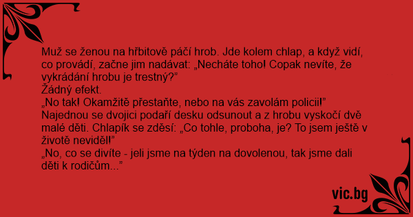 Muž se ženou na hřbitově páčí hrob. Jde kolem chlap, a když vidí, co provádí, začne jim nadávat: „Necháte toho! Copak nevíte, že vykrádání hrobu je trestný?”