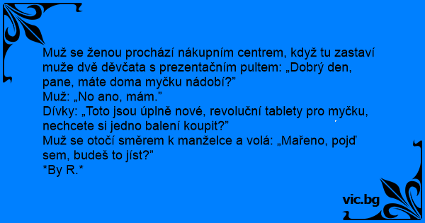 Muž se ženou prochází nákupním centrem, když tu zastaví muže dvě děvčata s prezentačním pultem: „Dobrý den, pane, máte doma myčku nádobí?”