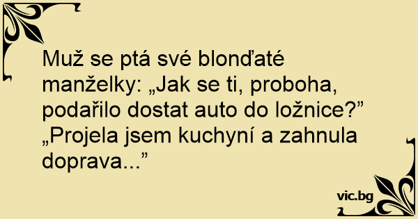Muž se ptá své blonďaté manželky: „Jak se ti, proboha, podařilo dostat auto do ložnice?”