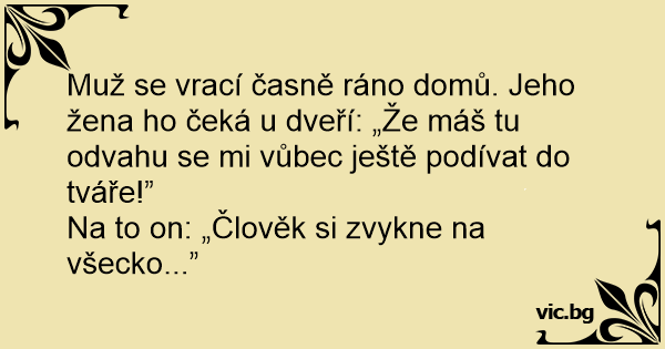 Muž se vrací časně ráno domů. Jeho žena hо čeká u dveří: „Že máš tu odvahu se mi vůbec ještě podívat do tváře!”