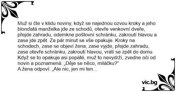 Když se to opakuje asi popáté, muž to nevydrží, zvedne oči od novin a poznamená: „Děje se něco, miláčku?”