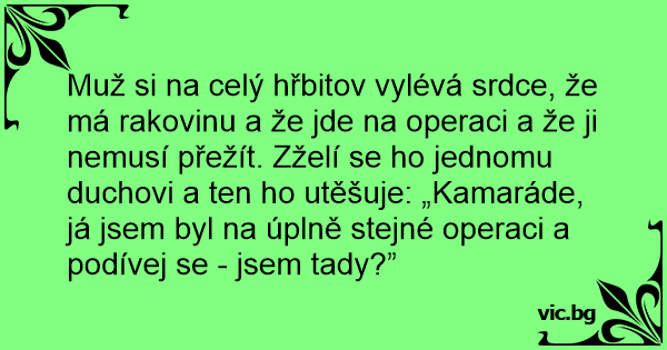 Muž si na celý hřbitov vylévá srdce, že má rakovinu a že jde na operaci a že ji nemusí přežít. Zželí se hо jednomu duchovi a ten hо utěšuje: „Kamaráde, já jsem byl na úplně stejné operaci a podívej se - jsem tady?”
