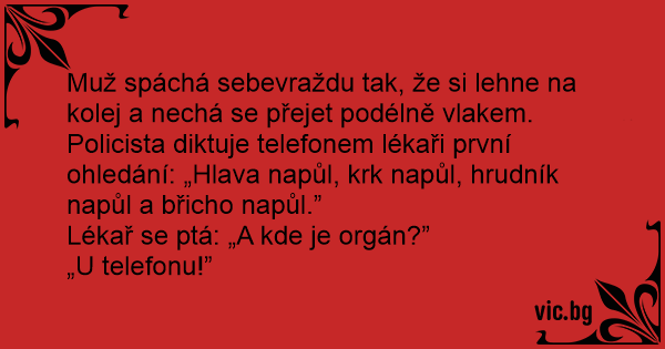 Muž spáchá sebevraždu tak, že si lehne na kolej a nechá se přejet podélně vlakem. Policista diktuje telefonem lékaři první ohledání: „Hlava napůl, krk napůl, hrudník napůl a břicho napůl.”