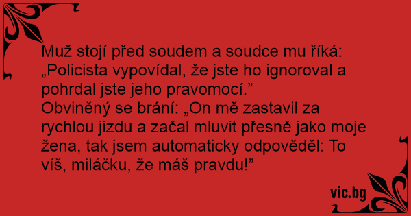 Obviněný se brání: „On mě zastavil za rychlou jizdu a začal mluvit přesně jako moje žena, tak jsem automaticky odpověděl: To víš, miláčku, že máš pravdu!”