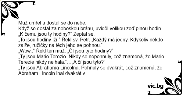 „To jsou hodiny lží.“ Řekl sv. Petr. „Každý má jedny. Kdykoliv někdo zalže, ručičky na těch jeho se pohnou.“