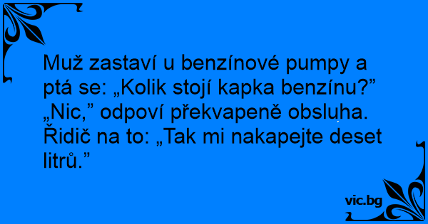 Muž zastaví u benzínové pumpy a ptá se: „Kolik stojí kapka benzínu?”