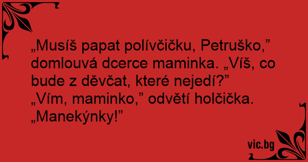„Musíš papat polívčičku, Petruško,” domlouvá dcerce maminka. „Víš, co bude z děvčat, které nejedí?”