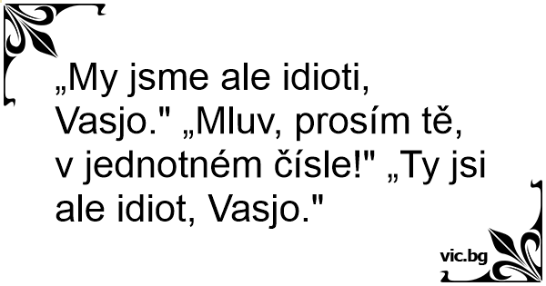 „My jsme ale idioti, Vasjo." „Mluv, prosím tě, v jednotném čísle!" „Ty jsi ale idiот, Vasjo."