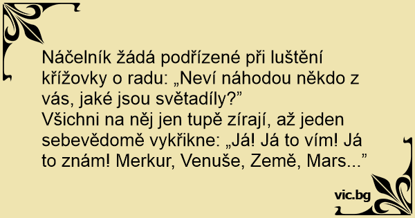Všichni na něj jen tupě zírají, až jeden sebevědomě vykřikne: „Já! Já to vím! Já to znám! Merkur, Venuše, Země, Mars...”