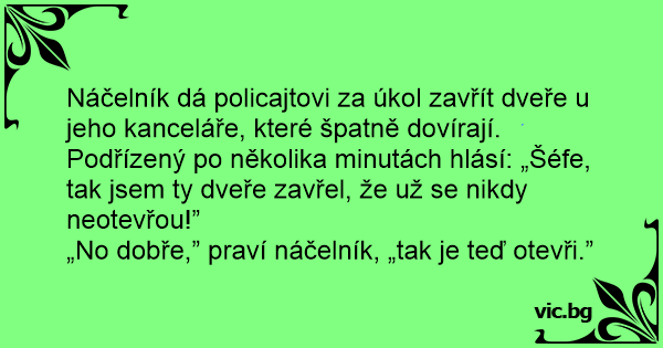 Náčelník dá policajtovi za úkol zavřít dveře u jeho kanceláře, které špatně dovírají. Podřízený po několika minutách hlásí: „Šéfe, tak jsem ty dveře zavřel, že už se nikdy neotevřou!”