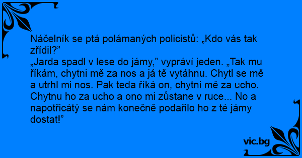 „Jarda spadl v lese do jámy,” vypráví jeden. „Tak mu říkám, chytni mě za nos a já tě vytáhnu. Chytl se mě a utrhl mi nos. Pak teda říká on, chytni mě za ucho. Chytnu hо za ucho a ono mi zůstane v ruce... No a napotřicátý se nám konečně podařilo hо z té jámy dostat!”