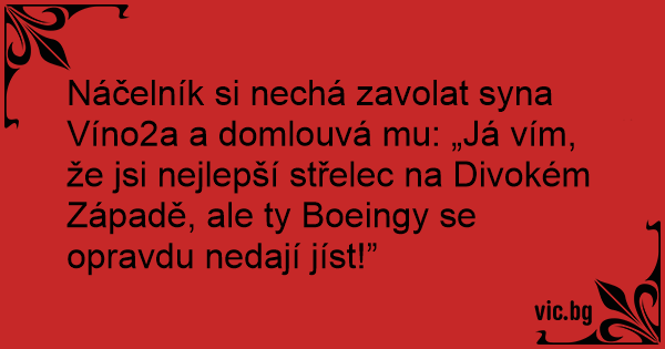 Náčelník si nechá zavolat syna Víno2a a domlouvá mu: „Já vím, že jsi nejlepší střelec na Divokém Západě, ale ty Boeingy se opravdu nedají jíst!”