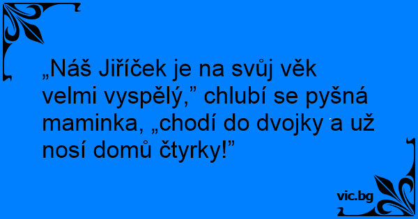„Náš Jiříček je na svůj věk velmi vyspělý,” chlubí se pyšná maminka, „chodí do dvojky a už nosí domů čtyrky!”