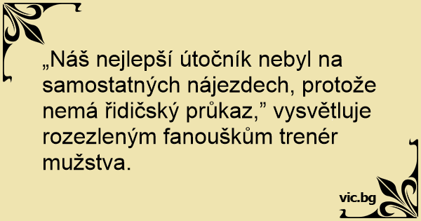 „Náš nejlepší útočník nebyl na samostatných nájezdech, protože nemá řidičský průkaz,” vysvětluje rozezleným fanouškům trenér mužstva.