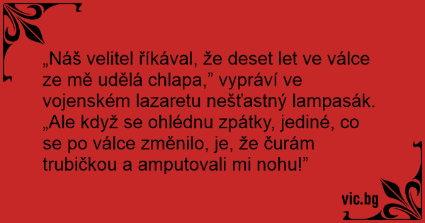„Náš velitel říkával, že deset let ve válce ze mě udělá chlapa,” vypráví ve vojenském lazaretu nešťastný lampasák. „Ale když se ohlédnu zpátky, jediné, co se po válce změnilo, je, že čurám trubičkou a amputovali mi nohu!”