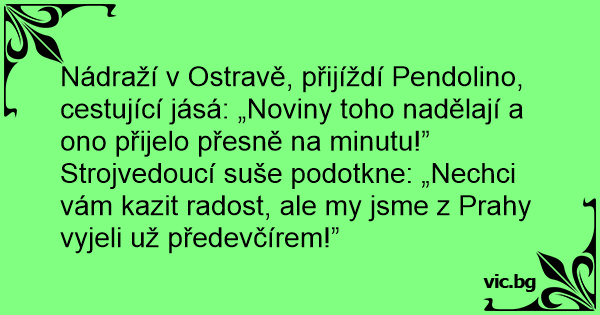 Strojvedoucí suše podotkne: „Nechci vám kazit radost, ale my jsme z Prahy vyjeli už předevčírem!”