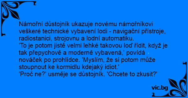 'To je potom jistě velmi lehké takovou loď řídit, když je tak přepychově a moderně vybavená,' povídá nováček po prohlídce. 'Myslím, že si potom může stoupnout ke kormidlu kdejaký idiот.'