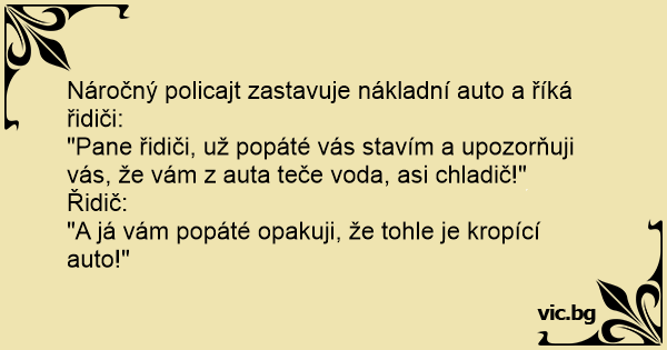 "Pane řidiči, už popáté vás stavím a upozorňuji vás, že vám z auta teče voda, asi chladič!"