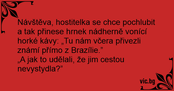 Návštěva, hostitelka se chce pochlubit a tak přinese hrnek nádherně vonící horké kávy: „Tu nám včera přivezli známí přímo z Brazílie.”