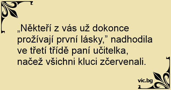 „Někteří z vás už dokonce prožívají první lásky,” nadhodila ve třetí třídě paní učitelka, načež všichni kluci zčervenali.