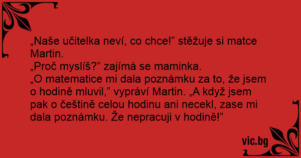 „O matematice mi dala poznámku za to, že jsem o hodině mluvil,” vypráví Martin. „A když jsem pak o češtině celou hodinu ani necekl, zase mi dala poznámku. Že nepracuji v hodině!”