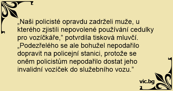 „Naši policisté opravdu zadrželi muže, u kterého zjistili nepovolené používání cedulky pro vozíčkáře,” potvrdila tisková mluvčí. „Podezřelého se ale bohužel nepodařilo dopravit na policejní stanici, protože se oněm policistům nepodařilo dostat jeho invalidní vozíček do služebního vozu.”