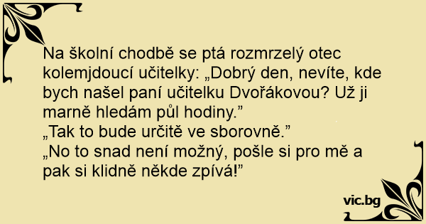 Na školní chodbě se ptá rozmrzelý otec kolemjdoucí učitelky: „Dobrý den, nevíte, kde bych našel paní učitelku Dvořákovou? Už ji marně hledám půl hodiny.”
