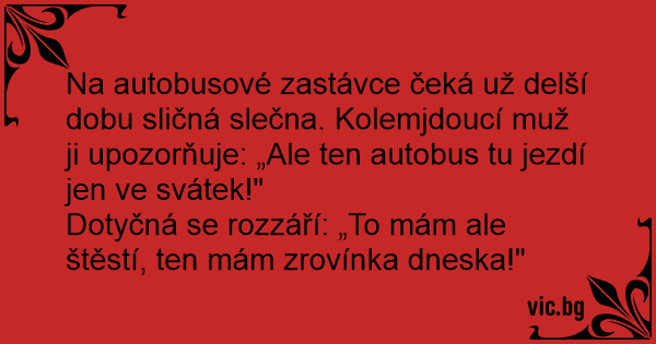 Na autobusové zastávce čeká už delší dobu sličná slečna. Kolemjdoucí muž ji upozorňuje: „Ale ten autobus tu jezdí jen ve svátek!"