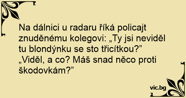 Na dálnici u radaru říká policajt znuděnému kolegovi: „Ty jsi neviděl tu blondýnku se sto třicítkou?”