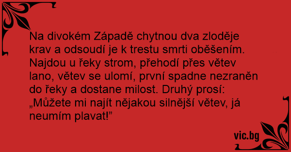 Na divokém Západě chytnou dva zloděje krav a odsoudí je k trestu smrti oběšením. Najdou u řeky strom, přehodí přes větev lano, větev se ulomí, první spadne nezraněn do řeky a dostane milost. Druhý prosí: „Můžete mi najít nějakou silnější větev, já neumím plavat!”
