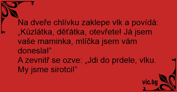 Na dveře chlívku zaklepe vlk a povídá: „Kůzlátka, děťátka, otevřete! Já jsem vaše maminka, mlíčka jsem vám donesla!”