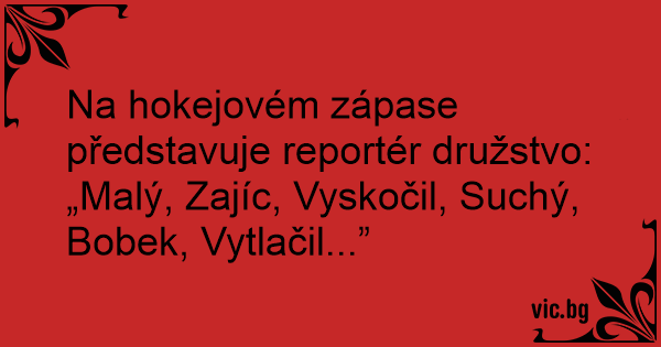 Na hokejovém zápase představuje reportér družstvo: „Malý, Zajíc, Vyskočil, Suchý, Bobek, Vytlačil...”