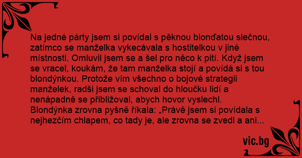 Na jedné párty jsem si povídal s pěknou blonďatou slečnou, zatímco se manželka vykecávala s hostitelkou v jiné místnosti. Omluvil jsem se a šel pro něco k pití. Když jsem se vracel, koukám, že tam manželka stojí a povídá si s tou blondýnkou. Protože vím všechno o bojové strategii manželek, radši jsem se schoval do hloučku lidí a nenápadně se přibližoval, abych hovor vyslechl.