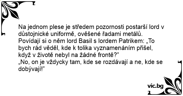 Na jednom plese je středem pozornosti postarší lord v důstojnické uniformě, ověšené řadami metálů. Povídají si o něm lord Basil s lordem Patrikem: „To bych rád věděl, kde k tolika vyznamenáním přišel, když v životě nebyl na žádné frontě?”