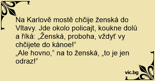 Na Karlově mostě chčije ženská do Vltavy. Jde okolo policajt, koukne dolů a říká: „Ženská, proboha, vždyť vy chčijete do kánoe!”