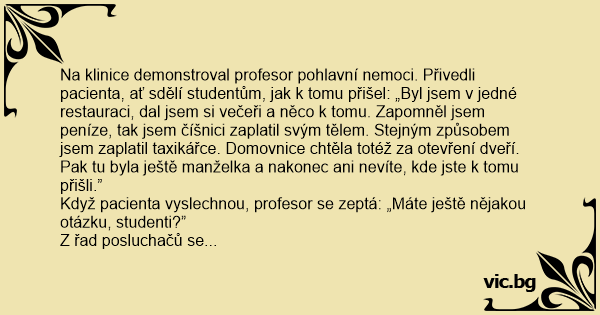 Na klinice demonstroval profesor pohlavní nemoci. Přivedli pacienta, ať sdělí studentům, jak k tomu přišel: „Byl jsem v jedné restauraci, dal jsem si večeři a něco k tomu. Zapomněl jsem peníze, tak jsem číšnici zaplatil svým tělem. Stejným způsobem jsem zaplatil taxikářce. Domovnice chtěla totéž za otevření dveří. Pak tu byla ještě manželka a nakonec ani nevíte, kde jste k tomu přišli.”