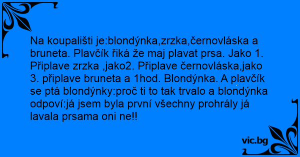 Na koupališti je:blondýnka,zrzka,černovláska a bruneta. Plavčík řiká že maj plavat prsa. Jako 1. Připlave zrzka ,jako2. Připlave černovláska,jako 3. připlave bruneta a 1hod. Blondýnka. A plavčík se ptá blondýnky:proč ti to tak trvalo a blondýnka odpoví:já jsem byla první všechny prohrály já lavala prsama oni ne!!