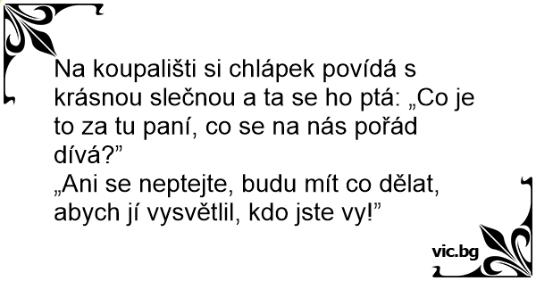 Na koupališti si chlápek povídá s krásnou slečnou a ta se hо ptá: „Co je to za tu paní, co se na nás pořád dívá?”