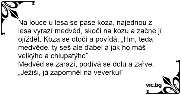 Na louce u lesa se pase koza, najednou z lesa vyrazí medvěd, skočí na kozu a začne jí ojíždět. Koza se otočí a povídá: „Hm, teda medvěde, ty seš ale ďábel a jak hо máš velkýho a chlupatýho˝.