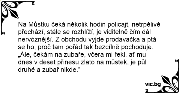 „Ále, čekám na zubaře, včera mi řekl, ať mu dnes v deset přinesu zlato na můstek, je půl druhé a zubař nikde.”