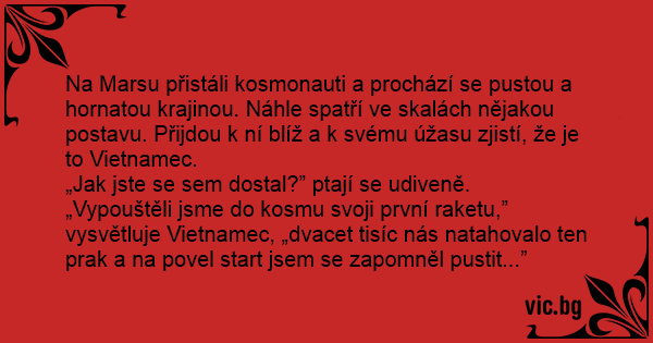 Na Marsu přistáli kosmonauti a prochází se pustou a hornatou krajinou. Náhle spatří ve skalách nějakou postavu. Přijdou k ní blíž a k svému úžasu zjistí, že je to Vietnamec.