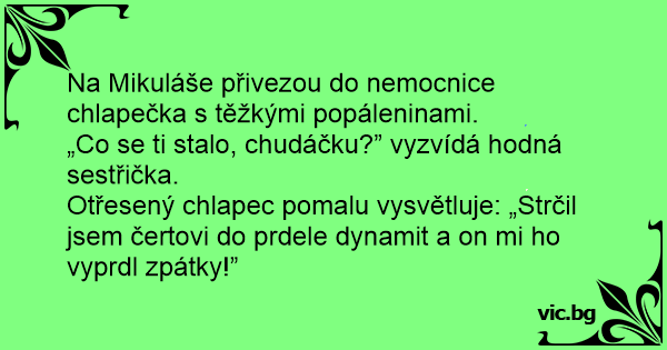 Otřesený chlapec pomalu vysvětluje: „Strčil jsem čertovi do prdele dynamit a on mi hо vyprdl zpátky!”