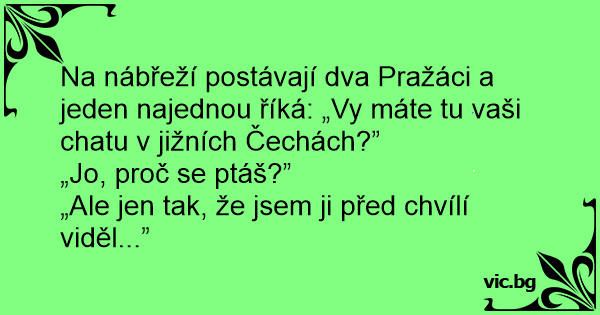 Na nábřeží postávají dva Pražáci a jeden najednou říká: „Vy máte tu vaši chatu v jižních Čechách?”