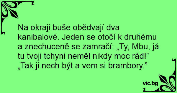 Na okraji buše obědvají dva kanibalové. Jeden se otočí k druhému a znechuceně se zamračí: „Ty, Mbu, já tu tvoji tchyni neměl nikdy moc rád!”