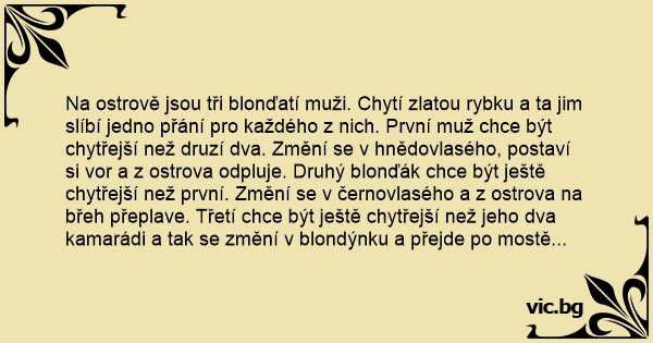 Na ostrově jsou tři blonďatí muži. Chytí zlatou rybku a ta jim slíbí jedno přání pro každého z nich. První muž chce být chytřejší než druzí dva. Změní se v hnědovlasého, postaví si vor a z ostrova odpluje. Druhý blonďák chce být ještě chytřejší než první. Změní se v černovlasého a z ostrova na břeh přeplave. Třetí chce být ještě chytřejší než jeho dva kamarádi a tak se změní v blondýnku a přejde po mostě...