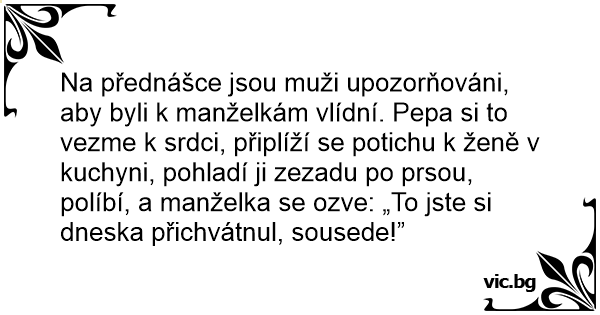 Na přednášce jsou muži upozorňováni, aby byli k manželkám vlídní. Pepa si to vezme k srdci, připlíží se potichu k ženě v kuchyni, pohladí ji zezadu po prsou, políbí, a manželka se ozve: „To jste si dneska přichvátnul, sousede!”